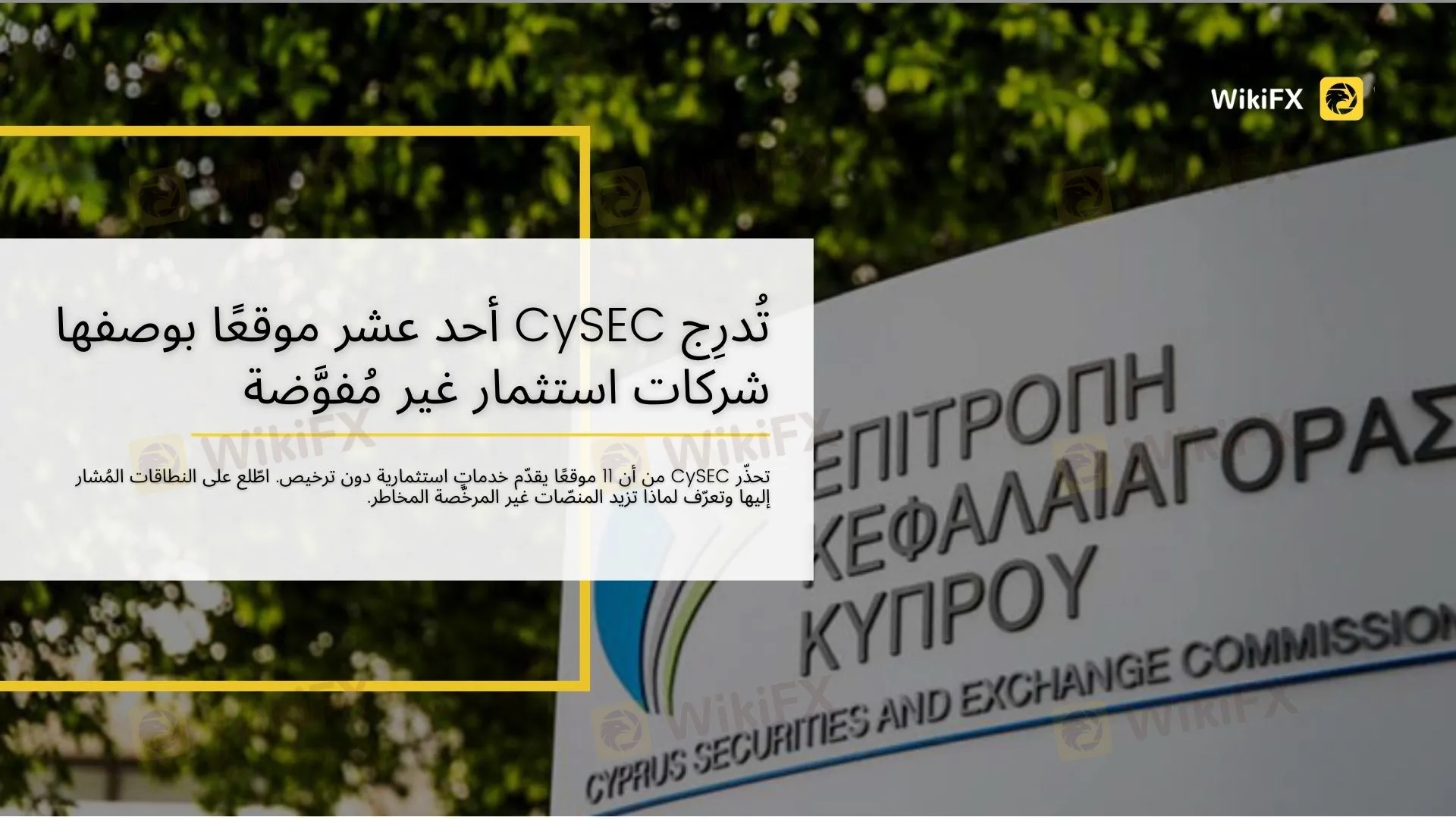 أصدرت لجنة الأوراق المالية والبورصات القبرصية (CySEC) تنبيهًا للمستثمرين تسمّي فيه أحد عشر موقعًا تُقدَّم، بحسب الجهة الرقابية، خدماتٍ استثمارية من دون التفويض المطلوب بموجب المادة 5 من القانون 87(I)/2017. وتشدّد CySEC على أن هذه المواقع غير مرتبطة بأي كيانٍ مرخّص مسموح له بتقديم خدماتٍ أو مزاولة أنشطة استثمارية داخل قبرص أو انطلاقًا منها.
