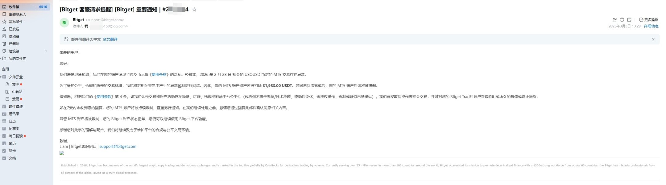 本人交易ID号为30949*****,因预判中东局势紧张,于上周五做了4手美国原油。周一预判正确,周一原油大涨。提交出金,刚开始平台要我填写他们问卷上所有内容,我按他们要求提交了所有内容后(人脸验证,持照拍照,公司资料),第2天又发了份邮件说我违规交易。我向提出要求说违规了哪条规定,他们说是第4条规定,我向他们提出具体的违规内容。他们很霸道的说就是违规。我在你们平台规定的时间,规定的杠杆,正常允许的情况下做的单,为什么说我违规。我相信有很多客户方向赌错了,你们是不是退回给客户金额。赚了我们说违规,客户亏了你们照收,你们这是2头吃法,十足的黑平台做法。试问平台: 1:刚开始叫我们填写问卷,等我们提交完成后又说违规,你们的诚信何在 2:本来就是对赌,赚了说我们违规,客户赌错亏钱你们有退钱?十足的黑平台 3:开户时说的天花乱坠,说出入金秒到账。你们的说法可笑? 4:说bitget说跟币安,欧易交易所齐名,出现这种情况你们不觉得脸红?