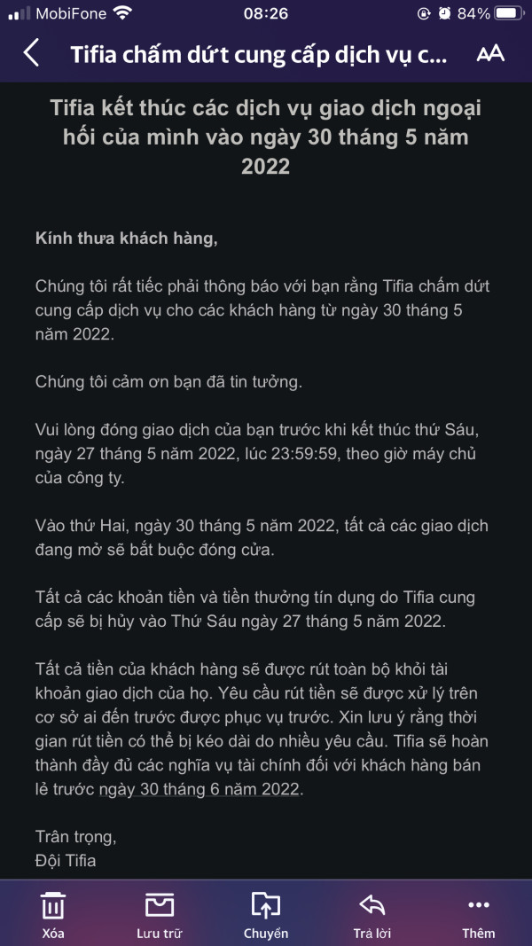 Vào ngày 27/05/2022 sàn thông báo ngừng cung cấp dịch vụ vào ngày 30/05/2022 và yêu cầu khách hàng rút tiền và sẽ được xử lý trước ngày 30/06/2022. Tôi đã thực hiện lệnh rút tiền và chờ đợi đến nay vẫn chưa được sàn xử lý lệnh, tôi đã email cho sàn và họ phản hồi tiếp tục chờ đợi, lệnh rút tiền của tôi được thực hiện vào ngày 24/05/2022 trước khi nhận được thông báo ngừng cung cấp dịch vụ nhưng vẫn chưa được xử lý.