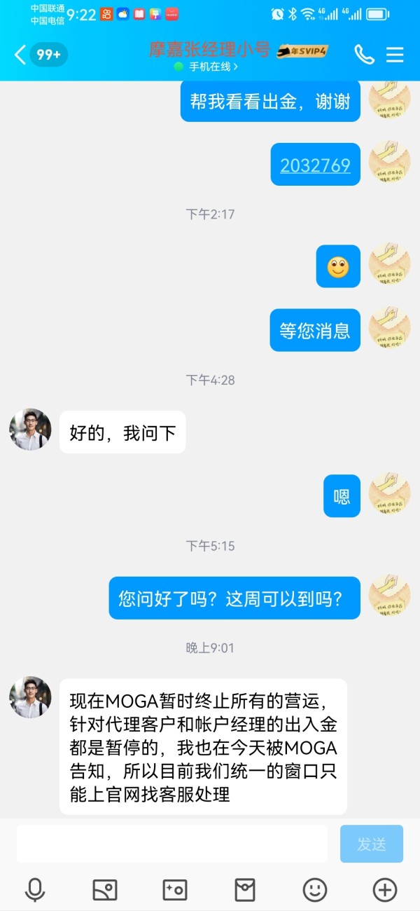 今天我的MOGAFX平台的交易账户2032769,剩余1390美金,申请出金一周多了,今天被客户经理告知 现在MOGA暂时终止所有的营运,针对代理客户和帐户经理的出入金都是暂停的,