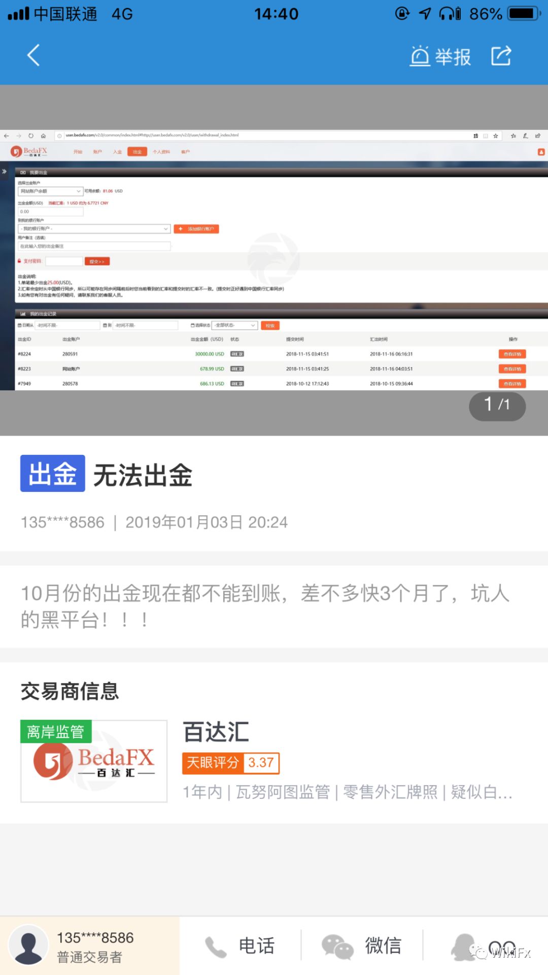 Recently, one of investors reported Bedafx to WikiFX's “Exposure” for the broker didn't refund the money withdrawn and the customer service staff was out of contact.