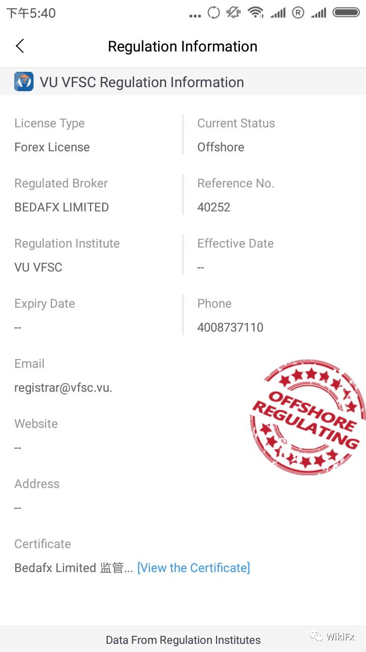 According to identification, with WikiFX rating being 3.37, Bedafx is regulated offshore.