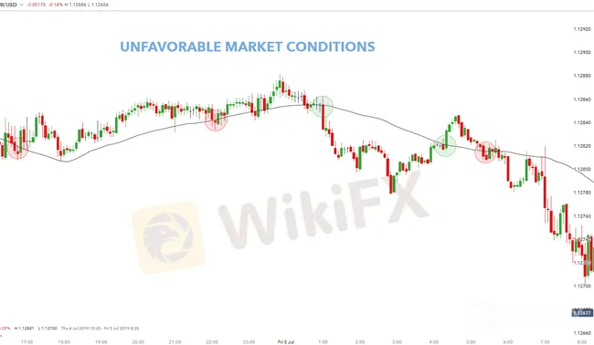 The chart below shows a typical example of forgone returns in unfavorable market conditions. The EUR/USD chart shows a trader targeting 20 pips per trade on a moving average (MA) price crossover trading strategy as highlighted by the circles which indicate entry points. When price crosses above the MA the trader looks to buy and when the price crosses below the MA line this signals a short entry. The red circles show trades that would have been unsuccessful in accordance with the strategy whilst the green circles show successful trades with 20 pip movements in the direction of the trade. This example illustrates a typical example of a trader targeting ‘x’ amount of pips in adverse conditions which often leads to revenge trading and losing trades.