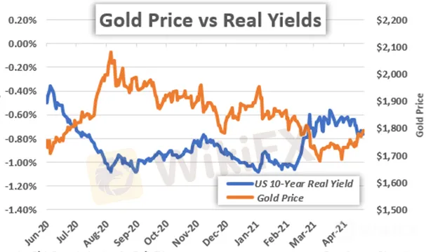 GOLD PRICE CHART WITH US TEN-YEAR REAL YIELD OVERLAID: DAILY TIME FRAME (02 JUNE 2020 TO 21 APRIL 2021)