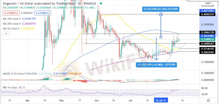 On Thursday, Dogecoin tested the June 25 high around $0.290. This implies that the bulls are determined to regain the multi-month DOGE price losses. This bullish bias is currently secured by the 50-day SMA support base at $0.221 forming the right side of a cup and handle chart pattern.