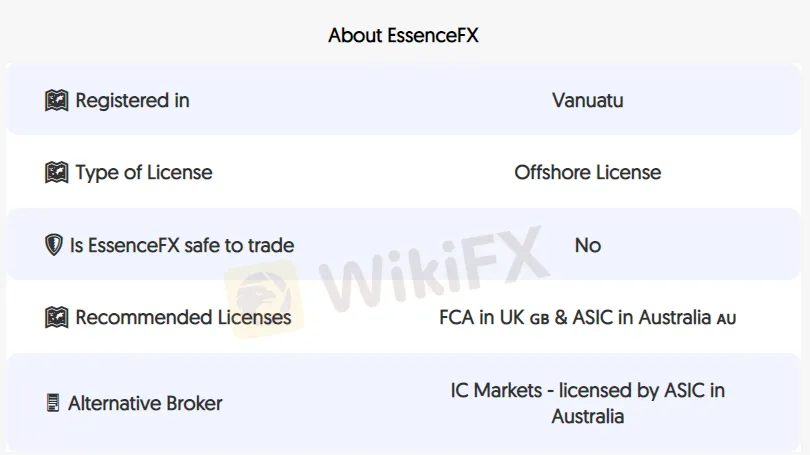 No, it is not safe to trade with EssenceFX, because it is an offshore broker. The Company is wholly owned by Essence Markets Limited under registration number 40309, regulated by the Vanuatu Financial Services Commission, and incorporated in the Republic of Vanuatu.