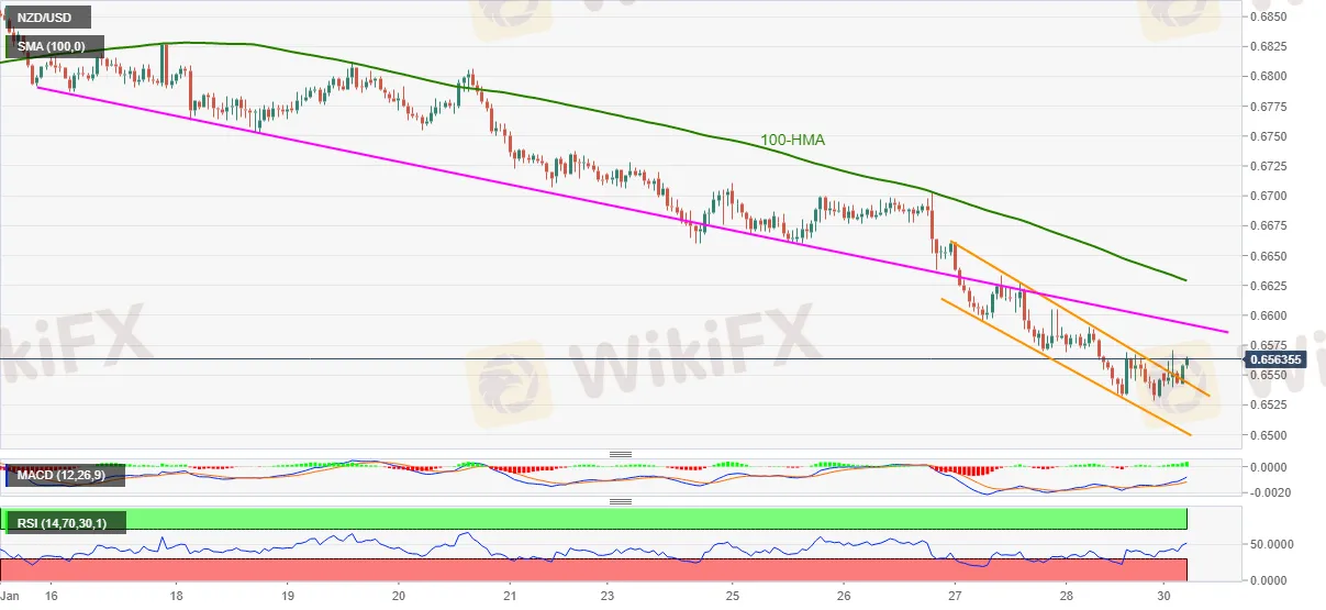 Even so, the previous support line from January 14, around 0.6595, precedes the 100-HMA level of 0.6628, challenging the NZD/USD bulls.