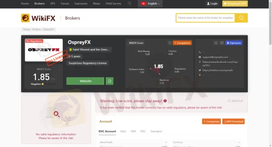 Due to its claimed, OspreyFX is an online foex broker that offers the trading service through the MT4 and MT5 platforms. The traders who invested in OspreyFX are provided with a leverage of up to 1:500. We have known that OspreyFX was registered in Saint Vincent and the Grenadines. However, Saint Vincent and the Grenadines is a well-known offshore zone. Besides, beware that this broker doesnt have a legitimate license, which means your money have a high risk under their management. WikiFX gives OspreyFX a very low rating of 1.85. Therefore, we advise you to seek a better alternative to invest in.