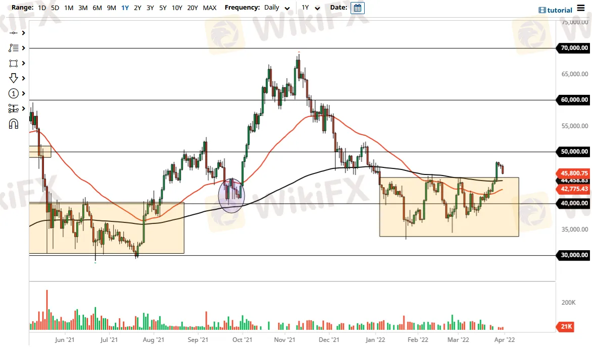 Abstract:Bitcoin has pulled back a bit during the trading session on Thursday as we have gotten a bit overextended. At this point, it looks as if we are going to test the $45,000 level, an area that previously had been major resistance. Furthermore, it is an area that also features the 200 Day EMA, so it does suggest that we could see “market memory” come into play there.