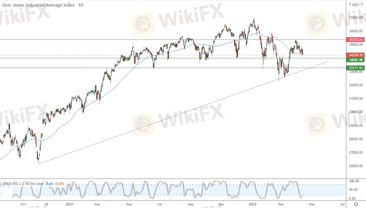 Abstract:The Dow Jones Industrial Average declined during its recent trading at the intraday levels, to record losses for the second day, by -0.26%, to lose the index by -87.74 points. It settled at the end of trading at the level of 34,220.35, after its decline in Monday's trading by -1.19%.