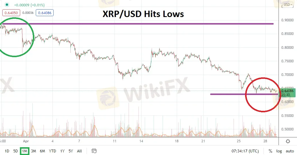XRP/USD has tested mid-term lows and is now coming within sight of depths it has not touched since late February. On the 24th of that month, XRP/USD challenged the 62 and half cents level, but then produced a solid bullish climb to the highs produced in late March. The month of April has not been easy for day traders of Ripple who have pursued upside, and as the month of May gets set to begin uneasy sentiment will have to be considered. Day traders who seek reversals upward certainly have important technical support to inspect, but the question is if these support levels will prove durable or if they will be swept aside?
