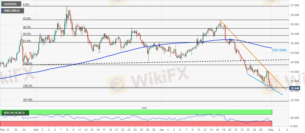 Abstract:Silver (XAG/USD) drops to the lowest levels since late February as it portrays the eight-day downtrend during Mondays Asian session. That said, the bright metal prints 0.55% intraday losses as bears attack the $22.65-60 support zone at the latest.