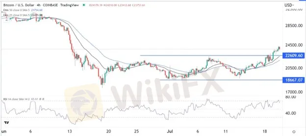 The four-hour chart shows that the BTC/USD pair has been in a strong bullish trend in the past few weeks. This week, the pair managed to move above the important resistance level at 22,610, which was the highest point since July 8th of this year.