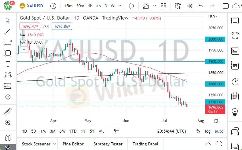 XAU/USD had a rough session on Wednesday as we are now below the $1700 level. Quite frankly, this is a very bad look for the market, but there is a significant amount of noise all the way down to the $1680 level. If we were to break down through that area, its likely that we will see a lot of selling pressure, perhaps opening up the “trapdoor” for this market.