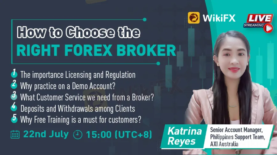 A Senior Account Manager, Philippines Support Team, Axi Australia, will do a live stream event tomorrow, July 2, 2022, at 3 PM UTC, to educate those who want to start trading forex on how to pick the proper forex broker. WikiFX Liveroom (en/live/202207217221918495.html).