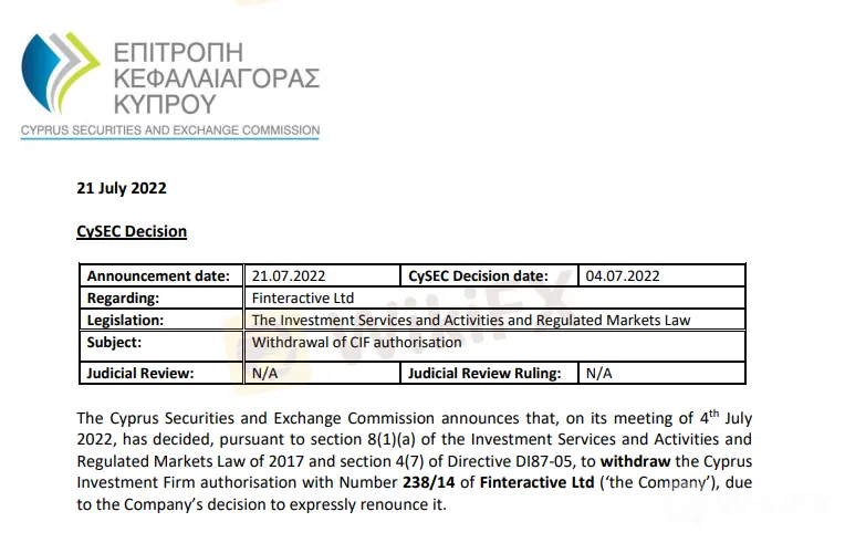 The Cyprus Securities and Exchange Commission (CySEC) announced Thursday that the regulator decided to revoke the Cyprus Investment Firm (CIF) authorization of Finteractive Ltd. because the company chose to abandon its Cyprus license. The company operates under the trading brand FXVC.