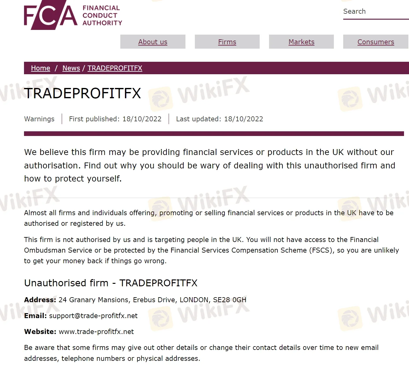 WikiFX Scam Alert: FCA Issued a Warning Against Trade-ProfitFx !!!