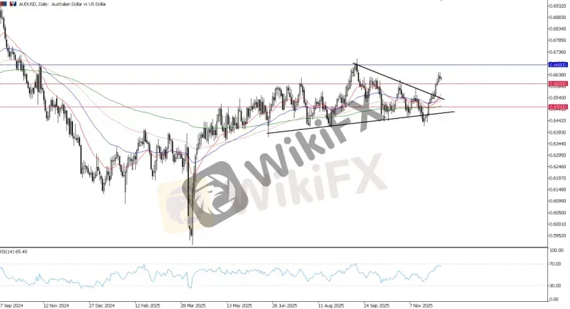 The technical outlook for AUD/USD remains positive, with the pair breaking out of a converging triangle and surpassing the 0.6600 support level, maintaining upside momentum.