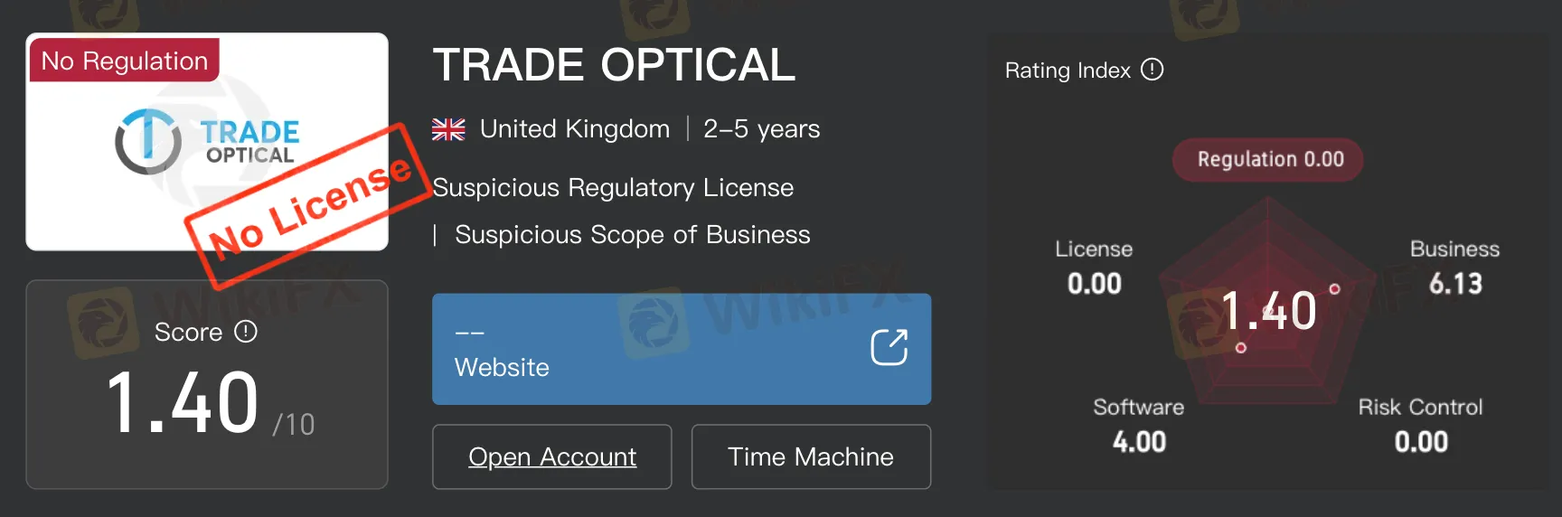 According to data published by WikiFX, TRADE OPTICAL currently holds a score of 1.40 out of 10. This low rating reflects multiple concerns identified across core evaluation dimensions, including regulatory status, risk control, and operational transparency.