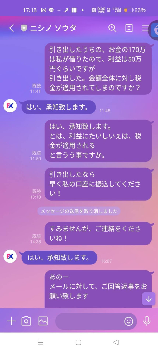 私のMT5アカウントは770674です。 Trends Creator Global取引所で操作して、ずっと出金できない状況です、彼らに連絡してもずっと返事がないです。 LINEで出金できないと話したら、グループから強制退室されました。 税金を払わせなければ出金できないとメールで教えてくれただけです。 かなり不安です。これは詐欺です。