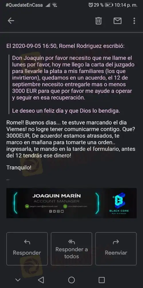 Extracto:Otra vez!... Otra vez!....Otra vez! Uno de los más malditos brokers estafan desenfrenadamente sin cesar en la región latinoamerica...Ojo! Fijaos que ese broker se llama Black Core. El primer artículo de exposición se trata de un caso relacionado al broker, y recientemente recibimos muchas denuncias contra el broker.