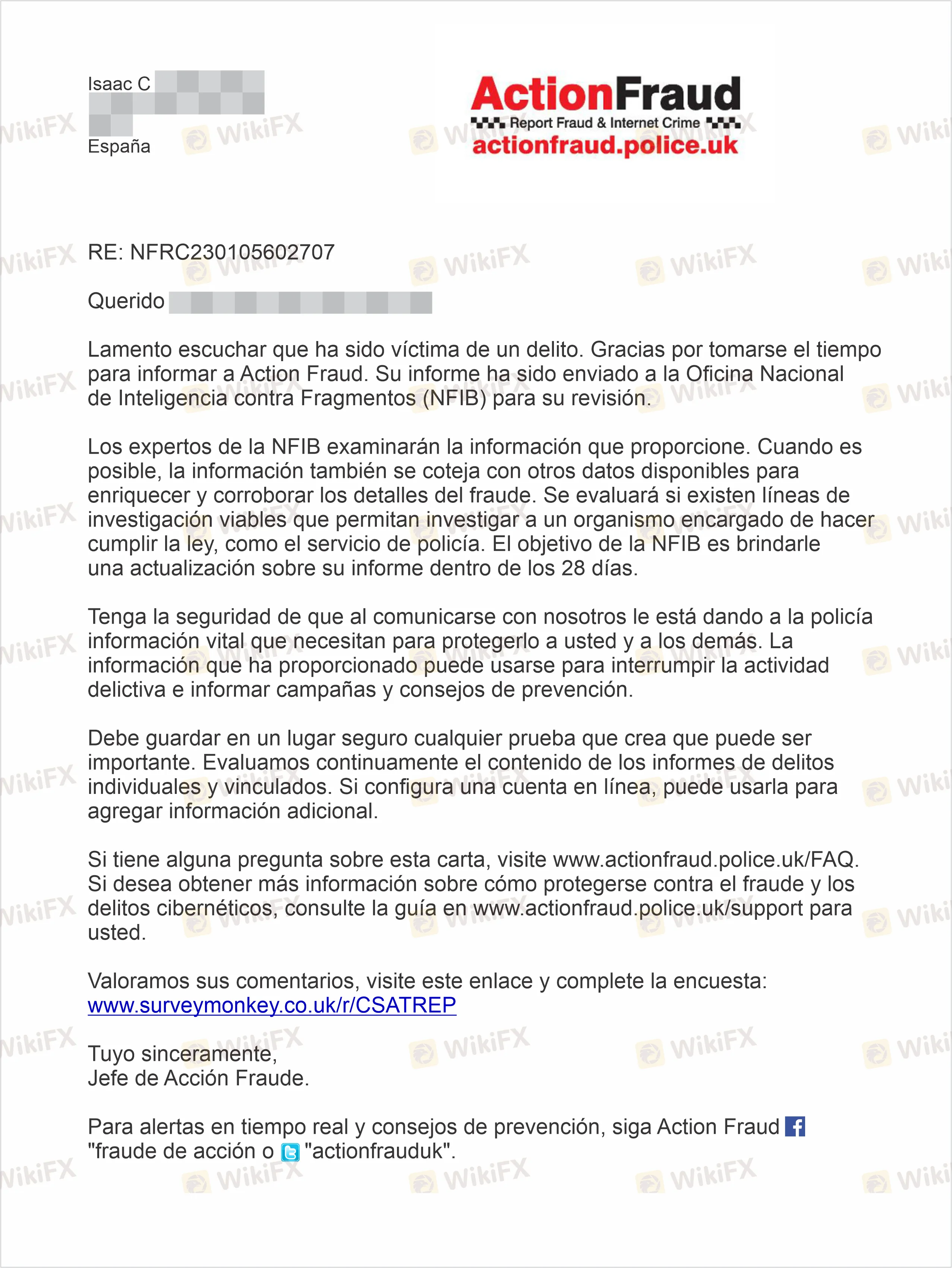 Esta fue la declaración dada por Isaac a nuestra sección de exposiciones en WikiFX sobre su experiencia con FXCapital360: “Soy una víctima de esta web fraudulenta, los he tenido que denunciar ante las autoridades británicas, la action Fraud y la Policía Nacional de España; y el Banco para que cancele las cuentas desde las cuales realizaba el ingreso para invertir. Se han quedado todo mi dinero, me han dejado arruinado y endeudado. No inviertan más en esta plataforma fraudulenta, pónganse en contacto con la FCA de Reino Unido y os dirán que es una empresa Clon y una estafa o ante la CNMV de España y os dirán que esta web está en un listado de Alertas catalogada chiringuitos financieros y que no tienen autorización para realizar operaciones. El Banco me a dicho que han detectado movimientos fraudulentos en dichas cuentas donde depositaba mis inversiones y que esas cuentas están a 0, estas personas están bien organizadas y estructuradas y os darán una imagen que no es real solo para haceros creer que son confiables y Invirtáis todo vuestro dinero en ellos para luego que dárselo todo. He adjuntado la confirmación de mi denuncia ante la Acción Fraud, la denuncia de la Policía Nacional no la adjunto por mis datos personales. Ante cualquier duda pregúntenme y os ayudaré. ¡¡Pero no Invirtáis más en ellos, si sois víctimas denunciar!! No os calléis, aunque no sea posible recuperar el dinero pero que quiten a esta gente para que no sigan robando a más personas como yo.”