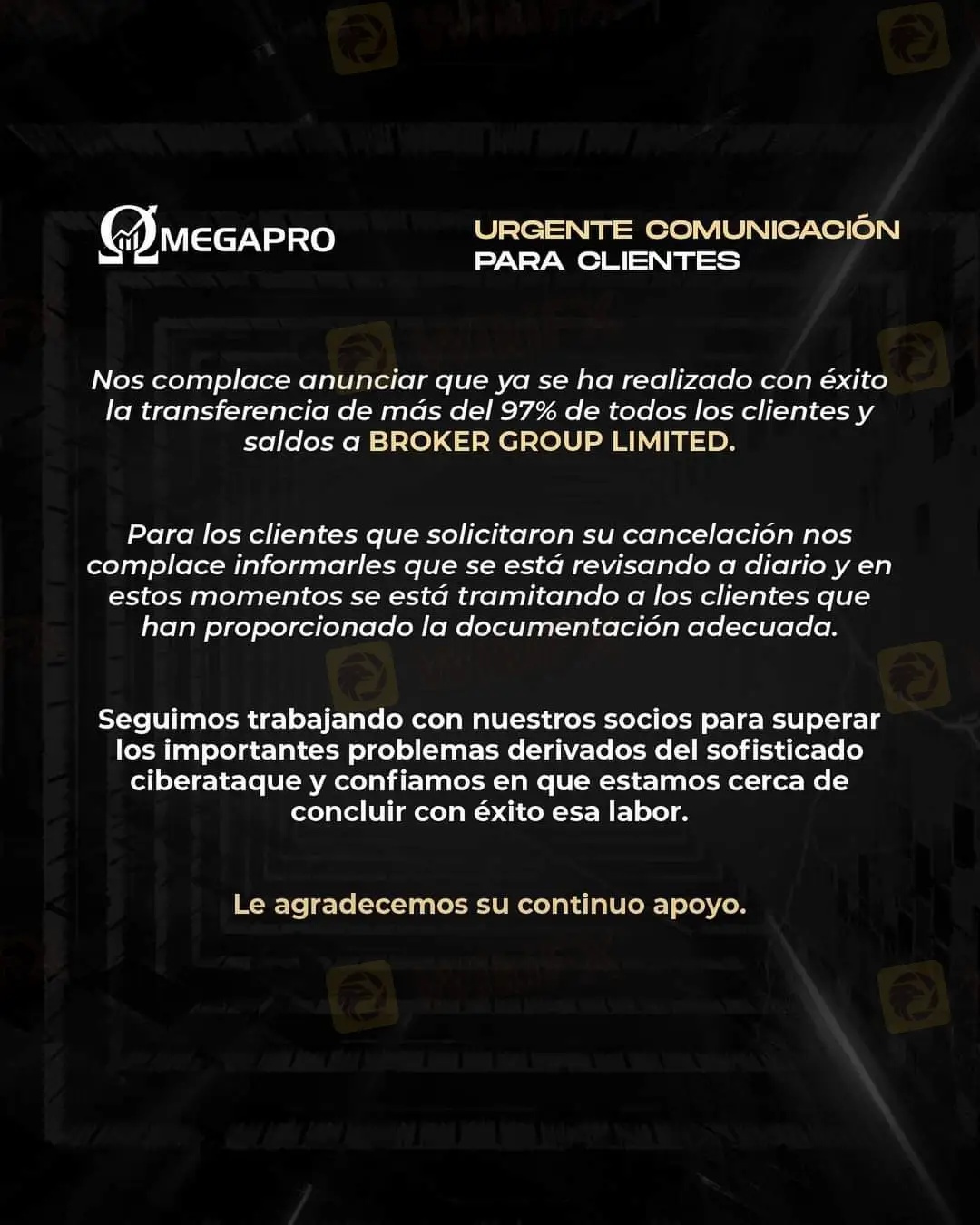 En este comunicado OmegaPro les informa a sus clientes que el 97% de las cuentas ya han sido trasladadas a Bróker Group. Mediante esta afirmación OmegaPro está aceptando que lo dicho en el comunicado del 29 de diciembre del 2022 era una mentira. En dicho comunicado afirmaban haber trasladado todas las cuentas a Bróker Group en esa fecha.