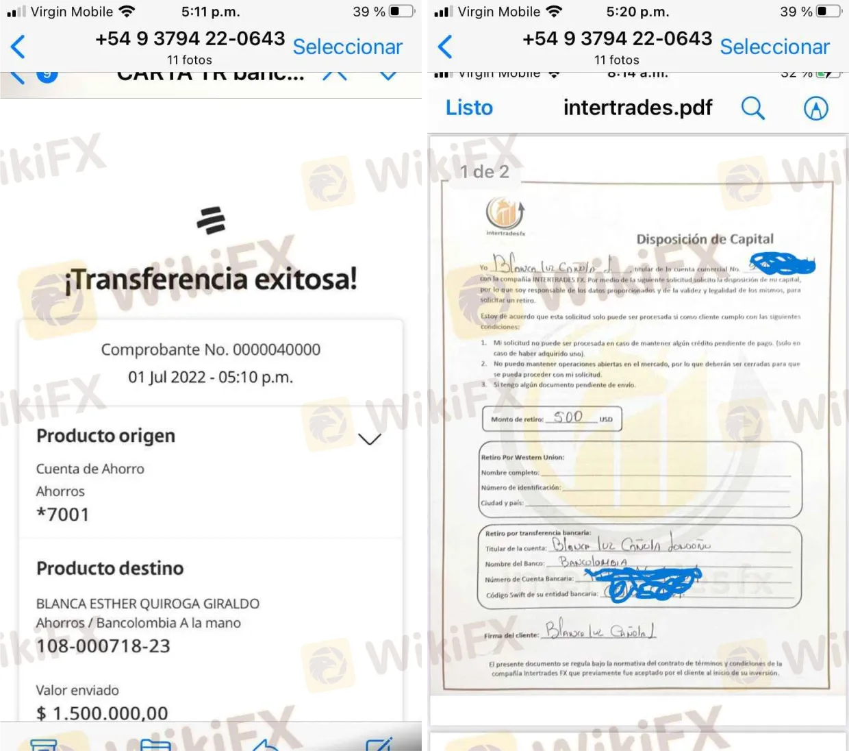 “Buenas tardes. Me dirijo a ustedes para que por favor me colaboren a recuperar mi dinero, ya que fui víctima de una estafa por IntertradesFx. Vi un anuncio en el Facebook y me registré porque quería invertir, el anuncio decía bróker certificado, pero el bróker como tal es IntertradesFx. Me registré, me llamaron muy convincentes. Les consigné 50 USD, luego otros 50 USD pero que para empezar a operar era con 100 USD, los consigné. luego me llamo él supuesto analista. Mandaba unas hojas con unos rendimientos cada 3 días. Se ganó mi confianza y me dijo que invirtiera más, que cada semana me iban a llegar 700 mil en pesos colombianos, y que la empresa los prestaba hasta la siguiente semana, yo acepté y a la siguiente semana le consigné 336 USD, y ya se perdió el sujeto Néstor García. Al mes me llamo un señor de la parte administradora y me dijo que mi cuenta estaba en ceros, que antes les debía 900 USD, que si no sabía cómo funcionaba el mercado y me dijo muchas cosas desagradables. Yo también le respondí son unos estafadores”.