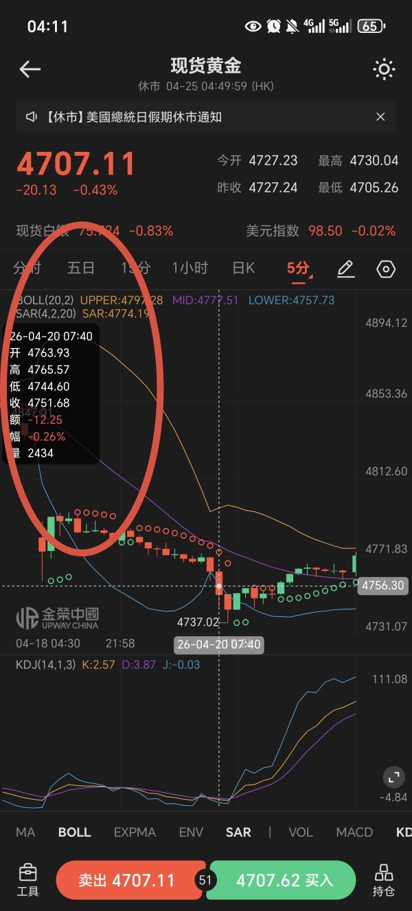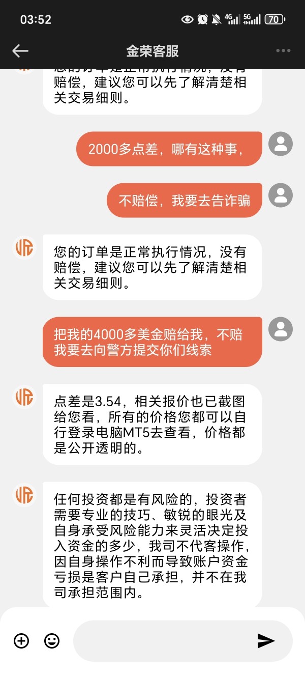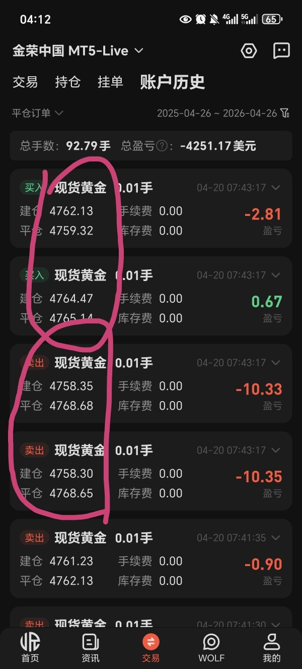 金荣中国,4月20号,7.43分,已不存在的市场价格强平我的多空锁仓单子,此时已经开盘一个多小时,他们点差是20,他们客服解释说此时调查扩大到354点,这简直是严重操控价格和点差。哪家平台有这么大的点差,而且开盘近两个小时了。4月20号,07:43:17,强平我4个单子,两个多单强平价4759.32,4765.14,空单:4768.68,4768.65。而且此时7.43的K线行情最高点才4765.57,完全没有4768.65这个价格。这简直是乱搞,诈骗。非常不公平。导致我亏损,这次是其中一次,多次遭到不公平待遇,共计亏损4300美金,要求金荣中国给我赔偿我本金4300美金。
