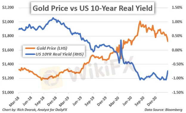 Ang mga presyo ng ginto ay nagpumilit mula noong umakyat ang mahalagang metal noong Agosto 2020. Sa katunayan, ang ginto ay nasa gilid ng paglubog sa teritoryo ng bear market kasunod ng -18% na pagtanggi mula sa lahat ng oras na mataas malapit sa antas ng presyo na $ 2,080. Ang napapanatiling alon ng presyon ng pagbebenta ng ginto higit sa lahat ay sumasalamin sa ilalim at pinakabagong pag-aangat sa 10-taong tunay na ani ng US. Ang pagkilos ng presyo ng ginto ay may kaugaliang lumipat sa kabaligtaran ng direksyon ng mga rate ng interes net ng mga inaasahan sa inflation na nakikita na ang mahalagang metal ay hindi nagbibigay ng ani.