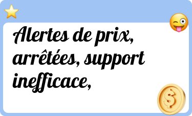 Mes alertes de prix ont cessé de s'activer il y a plus de 2 semaines, je leur ai envoyé des e-mails, le chat en direct est inutile car j'ai parlé à au moins 7 personnes et elles ont toutes disparu et le chat s'est terminé !!! C'est un support absurde, car maintenant je dois surveiller le marché toute la journée en attendant que le prix atteigne une zone spécifique.