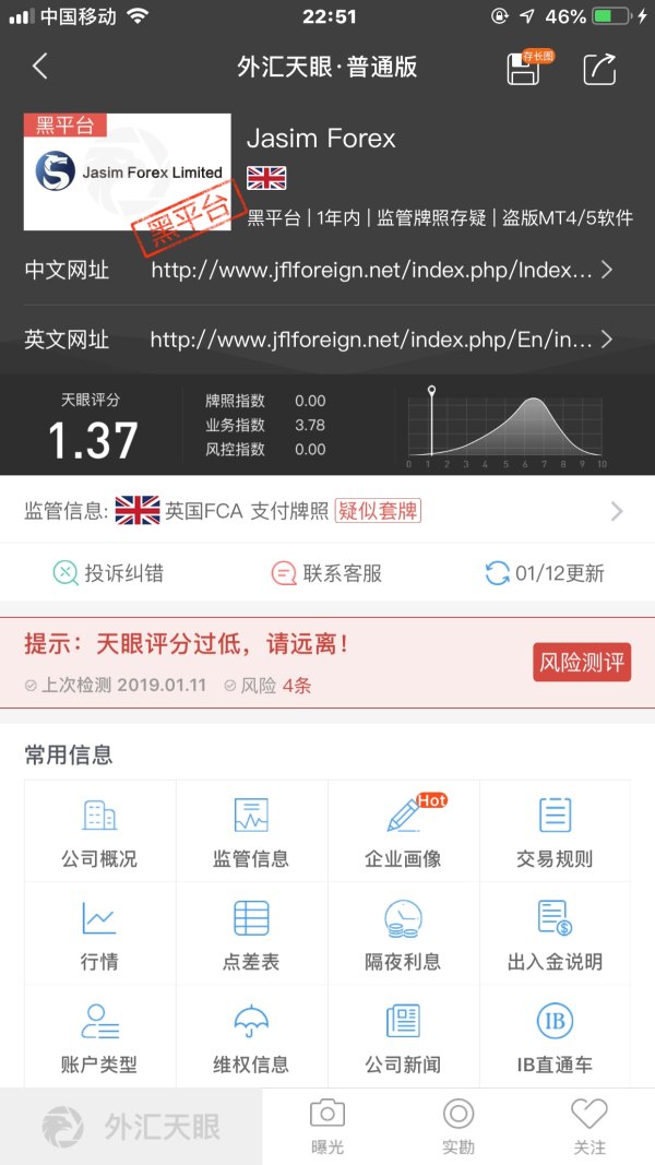 Jasim forex 从申请出金至今都没有落实,已经有半个月有余,前期与客服联系询问,告知出金系统在维护,请等待,元月9号公告停止出金业务,从此与客服联系不上,上周五停止出金业务公告撤去,但与客服还是联系不上;在贵平台查询jasim forex 是黑平台,