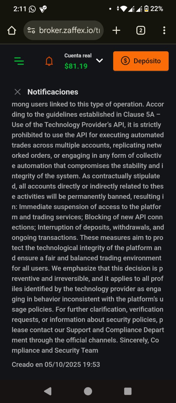 Estaba en el proyecto de GPTrading, dónde se manejaba un bot en dicha plataforma con interés compuesto y API. según ellos no puede dejarnos realizar el retiro debido a que utilizamos su API. Enviaron un mensaje desde soporte técnico a nosotros los usuarios,dando a entender que violamos la norma y que se solucionará, aún es el día y no dan respuesta desde el broker