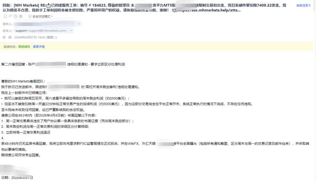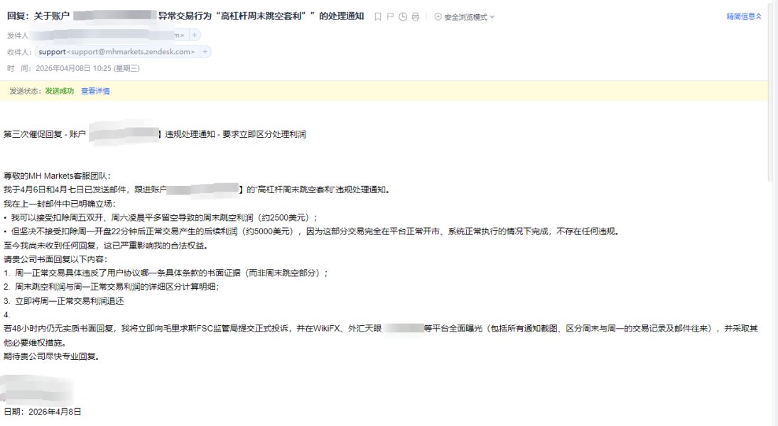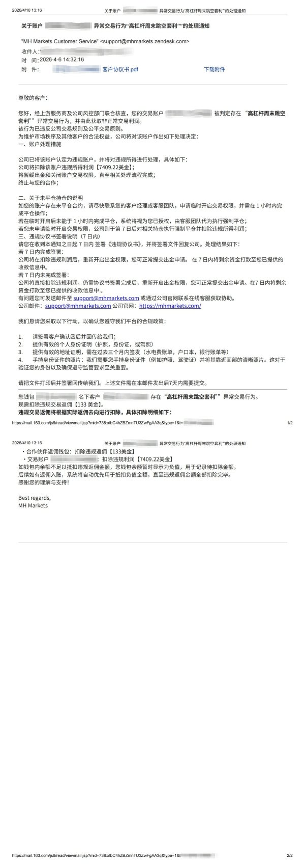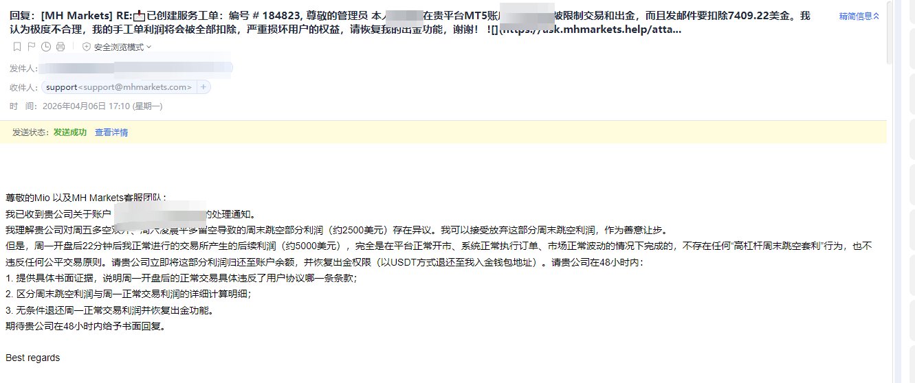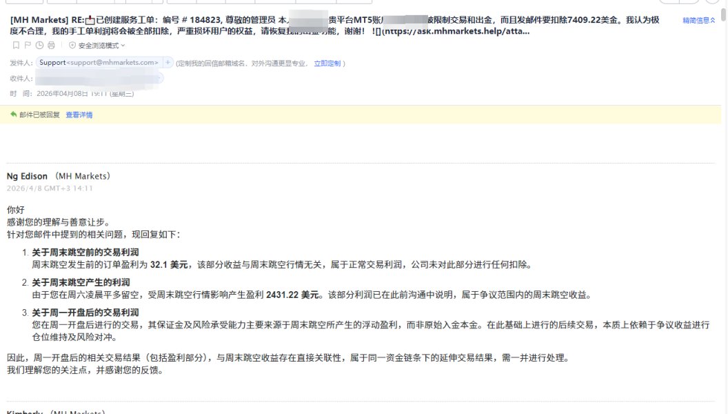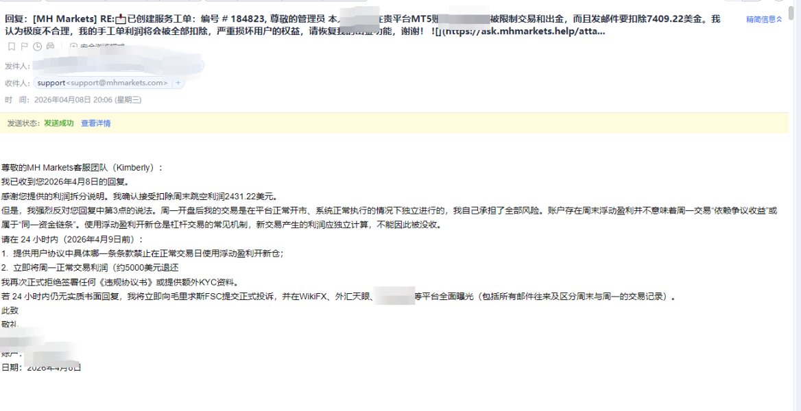 MH Markets(迈汇)扣除全部7409.22美元利润,拒绝区分周末跳空与周一正常交易,要求签违规协议+强制KYC才退剩余资金,三次邮件催促仍无实质回复 尊敬的WikiFX/及各位投资者: 本人通过USDT入金。 交易过程(有完整MT5交易历史截图为证): • 周四/周五现货黄金多空双开。 • 周五早上收盘前平掉多单,保留空单。 • 周末跳空后空单获利2431.22美元(我已明确书面接受扣除)。 • 周一开盘后 60 分钟内正常交易(平台正常开市、系统正常执行),获利约5000美元(我坚决不接受扣除)。 平台处理: 2026年4月10日,平台发出正式处理通知,判定存在“高杠杆周末跳空套利”异常交易行为,扣除全部7409.22美元利润,暂缓出金、关闭交易权限,并终止合作。 我的立场及邮件往来(全部有截图): • 我已连续三次书面邮件明确表示:接受扣除周末跳空2431.22美元,但坚决不接受扣除周一开盘后正常交易产生的后续利润。 • 平台回复(Ng Edison / Kimberly)将利润拆分为三部分: • 周末跳空前32.1美元为正常利润(不扣)。 • 周末跳空2431.22美元属于争议收益(要扣)。 • 周一正常交易利润则被以“保证金及风险承受能力主要来源于周末跳空浮动盈利,本质依赖争议收益,属于同一资金链条的延伸交易结果”为由,强行一并扣除。 • 平台最新通知要求我在7日内签署《违规协议书》,并提供完整KYC资料(个人身份证明、最近3个月地址证明、手持身份证照片等),否则不处理出金。 我的诉求: 1. 立即退还周一正常交易利润(约5000美元)。 2. 平台必须提供具体用户协议条款,证明在正常交易日使用浮动盈利开新仓属于违规行为。 3. 停止要求签署《违规协议书》和提供额外KYC资料(入金时并未要求)。 证据清单(已全部附图): • 平台4月10日违规处理通知全文(含要求签协议和KYC的内容)。 • 平台两次回复邮件(利润三部分拆分 + “资金链条延续”理由)。 • 本人三次催促邮件(4月6日、7日、8日)。 • MT5完整交易历史截图(可清晰区分周末跳空订单与周一正常交易订单)。 • 账户相关总结截图。 本人已正式拒绝签署任何《违规协议书》,也拒绝提供额外KYC资料。目前平台仍未