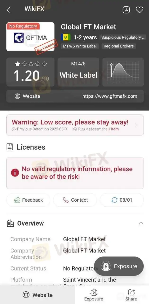 Global FT market के पास वैध लाइसेंस नहीं है। कृपया ध्यान दें कि एक दलाल जो किसी भी नियामक संस्था द्वारा विनियमित नहीं है, ग्राहकों के पैसे को धोखाधड़ी से ले जाने की अधिक संभावना है क्योंकि कोई भी इसे जवाबदेह नहीं रख सकता है।