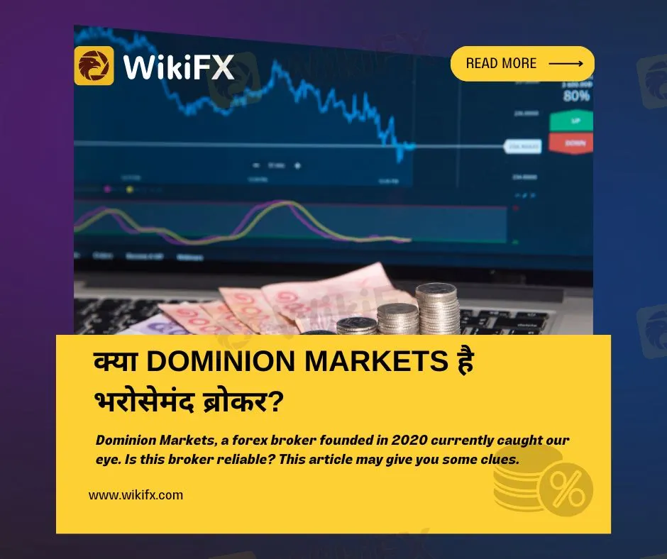 Dominion Markets एक ऑनलाइन ईसीएन विदेशी मुद्रा बाज़ार ब्रोकर है। 2020 में स्थापित और सेंट विंसेंट और ग्रेनेडाइंस में पंजीकृत इस ब्रोकर को दुनिया भर के ट्रेडर्स के लिए MetaTrader 5 पर व्यापारिक वातावरण प्रदान करने के लिए स्थापित किया गया था। इस ब्रोकर को ट्रेडर्स और शिक्षकों की एक टीम द्वारा अपने ग्राहकों को व्यापार करने के लिए एक प्रतिस्पर्धी और निष्पक्ष वातावरण प्रदान करने के लिए आयोजित किया गया था। यह ब्रोकर 200 से अधिक विदेशी मुद्रा जोड़े, प्रमुख सूचकांक और अन्य वित्तीय साधनों की पेशकश करता है। हालाँकि, WikiFX ने इस ब्रोकर को 10 में से 1.32 स्कोर दिए हैं।