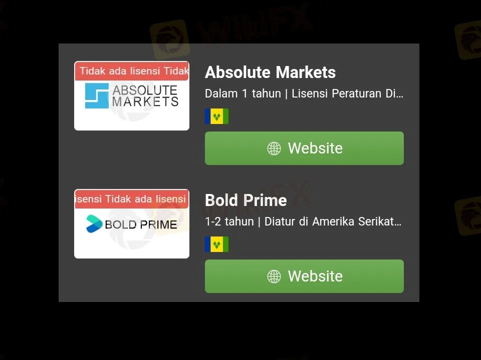 Fakta bahwa broker forex Absolute Markets dan Bold Prime telah mencapai skor WikiFX yang rendah karena mereka tidak memiliki lisensi dan status peraturan yang valid, dan juga mengalami beberapa kasus Eksposur yang tidak terselesaikan.