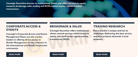 Carnegiefocalizzata su clienti istituzionali, fornisce servizi di ricerca azionaria, intermediazione, operazioni di vendita e transazioni relative a ECM (Equity Capital Markets) e fornisce servizi di consulenza qualificata in fusioni e acquisizioni aziendali, operazioni di equity capital market e prodotti finanziari strutturati.