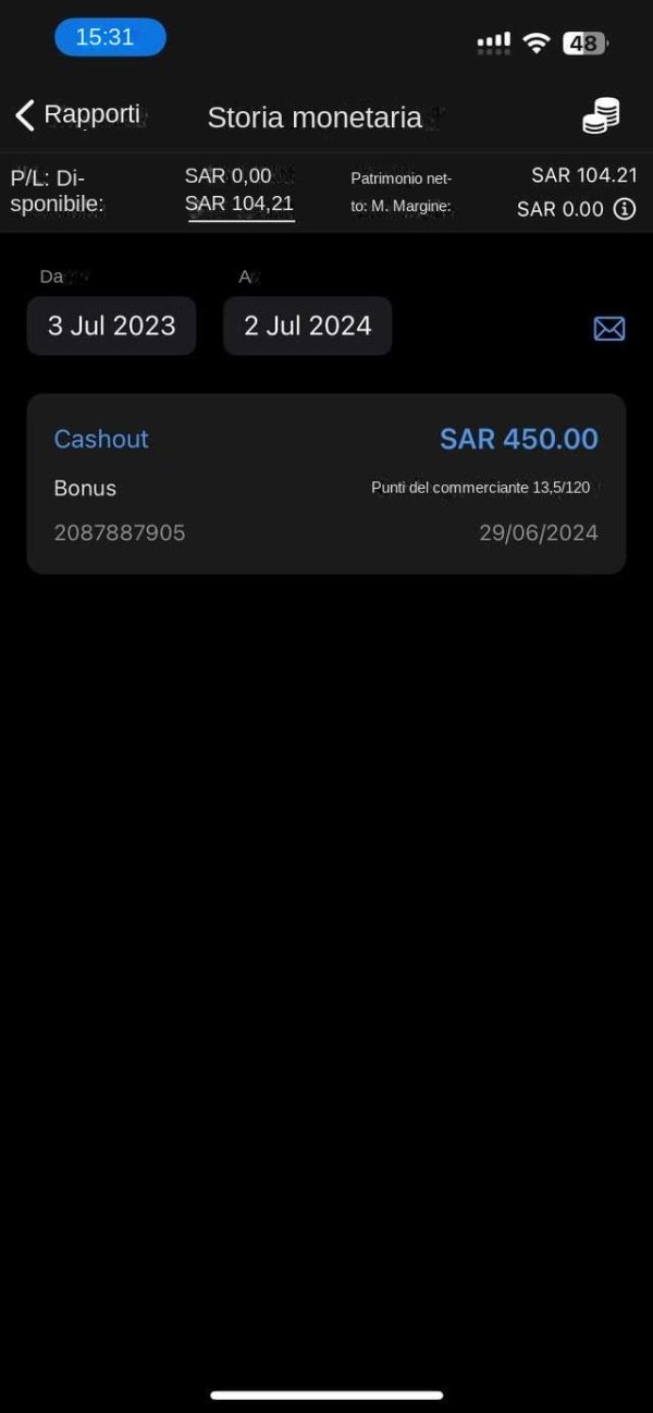 Mi hanno inviato un'email dicendo che avevano finanziato il mio account con 750 Sr. Quasi 200 dollari. E tutto quello che dovevo fare era fare trading e ottenere punti di trading ecc. per ricevere quei soldi. Tuttavia, ho scoperto che erano stati depositati solo 450. E quando ho chiesto informazioni, continuavano a tergiversare e a deviare dall'argomento.