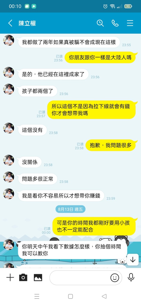 網路認識的網友,說要帶我賺錢,第一次有領到錢,第二次要領就不給出金了,一直要我繳認證金,沒錢繳還一直叫我借錢,不夠的他會幫我,結果要他幫忙時,不是突然失蹤,不然就說他很忙,明天再幫我,就一直拖時間,現在錢也領不出來,看的到卻用不到,網路交友要小心,不要隨意相信沒見過面的人,現在錢都卡在平臺理,大家要小心,不要被黑平臺騙了