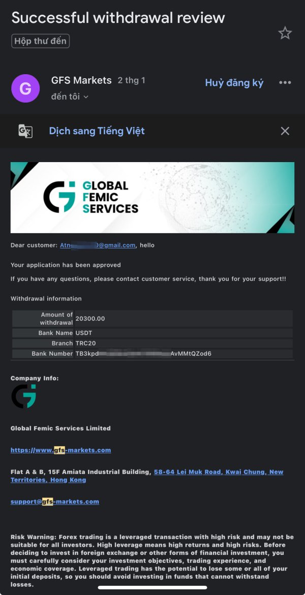Tôi đã nhận được thông báo rút tiền thành công từ đội ngũ support của GFS Nhưng số USDT vẫn chưa được chuyển vào địa chỉ ví của tôi Tôi đã nhận được thông báo rút tiền sẽ được xử lý sau kỳ nghỉ Tết Nguyên đán, nhưng vẫn chưa được xử lý Tôi đã gửi nhiều email nhưng vẫn chưa nhận được phản hồi Hiện tại tôi không thể đăng nhập vào trang web của công ty Đây là thông báo rút tiền đã hoàn tất vào ví của tôi từ ngày 02/01/2025. Tuy nhiên, tôi vẫn chưa nhận được USDT kể từ ngày đó