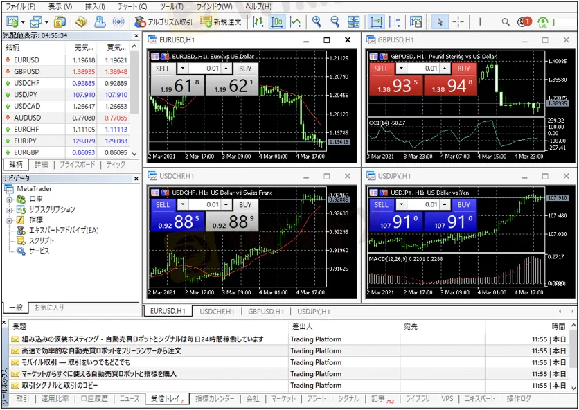MT4の特徴のひとつとしてEAと呼ばれる自動売買システム/ソフトウェアを利用する事ができます。EAは独自言語「MQL4」と呼ばれるプログラミング言語にり構築する事ができますが、MT4は世界中のFX会社で使われており数多くのトレーダーが既に多くの自動売買システムを公開又は販売しているので、自分にあったEAを利用する事が可能です。