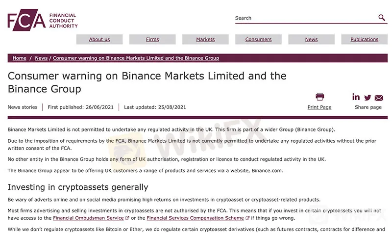 FCAはバイナンスがFCAの要件を満たしていると記載され、イギリスでの規制されたビジネスの運営はできないと発表。