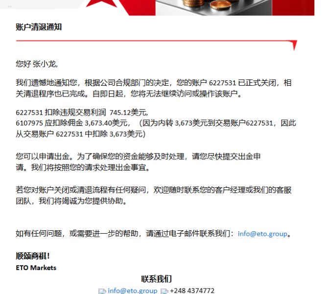 本人在ETOmarkets开户正常手法交易,结果到出金的时候收到平台发来的邮件说我违规交易需要扣除账面盈利和所有佣金。后面经过多次跟平台交涉他们也说不出我具体哪里违规反正就是不给出金。