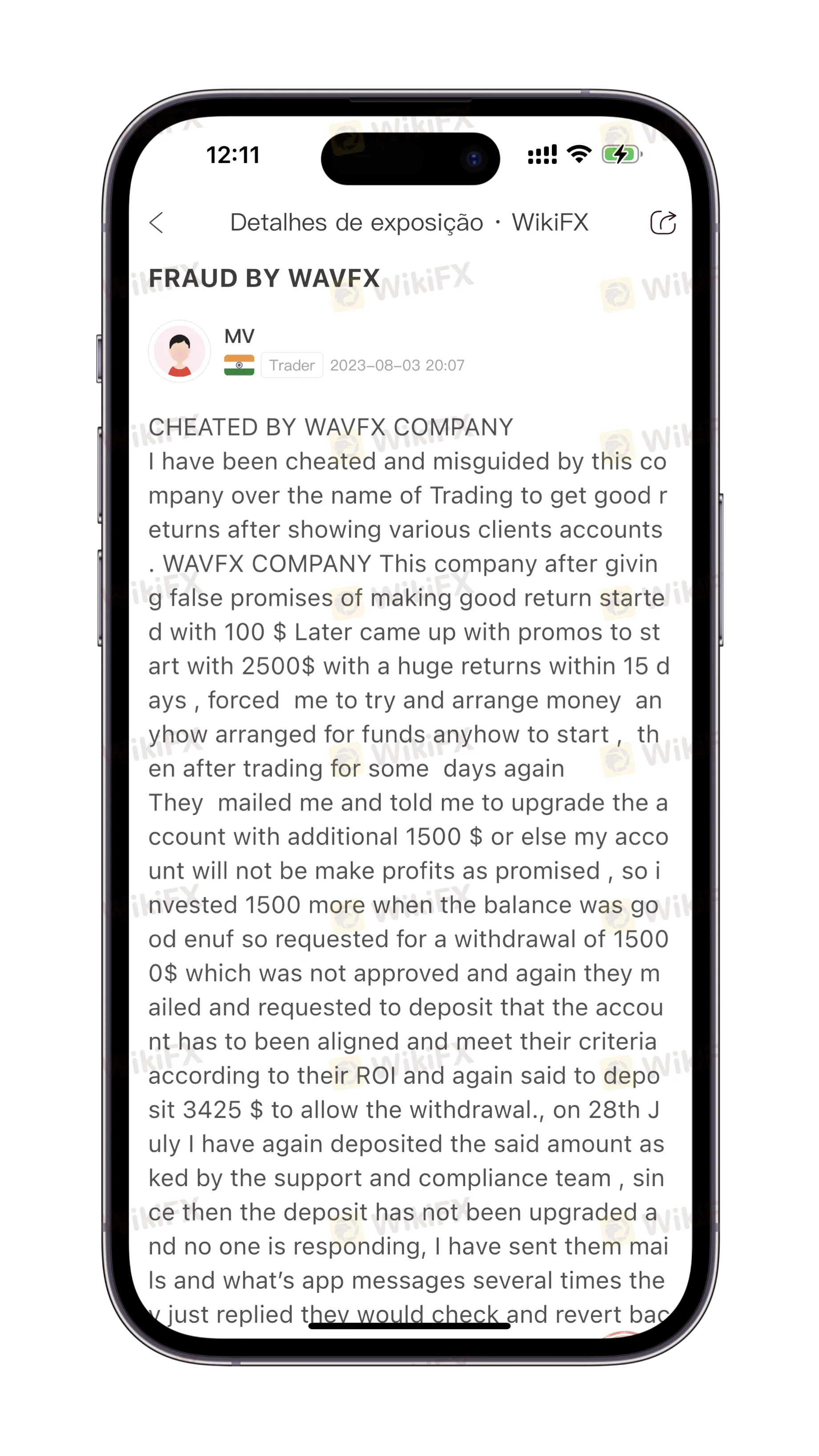 Recentemente, uma investidora indiana, Sra. “Manisha”, apresentou uma queixa ao WikiFX, expondo a fraude da plataforma WavFx e a impossibilidade de retirada de fundos.