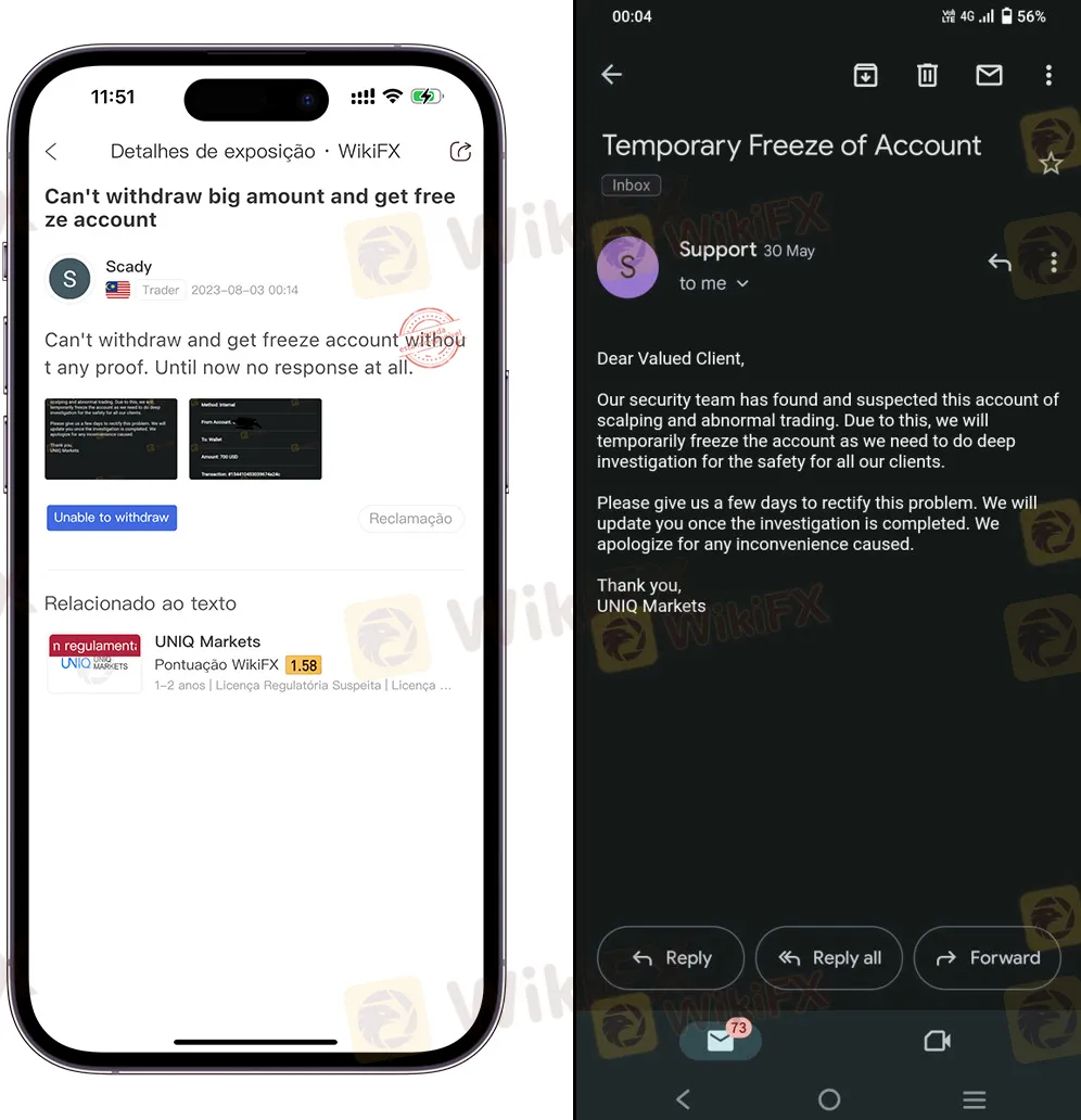 De acordo com o conteúdo do e-mail de congelamento temporário da conta fornecido por “Scady” da plataforma UNIQ Markets, a plataforma alega que sua equipe de segurança descobriu e suspeitou de atividades de scalping e negociações anormais em sua conta. Portanto, eles temporariamente congelaram a conta, pois a UNIQ Markets precisa conduzir uma investigação completa para garantir a segurança de todos os clientes. Eles afirmam que fornecerão informações atualizadas a “Scady”, a vítima, assim que a investigação estiver concluída. No entanto, passaram-se vários meses e ainda não houve resposta alguma.