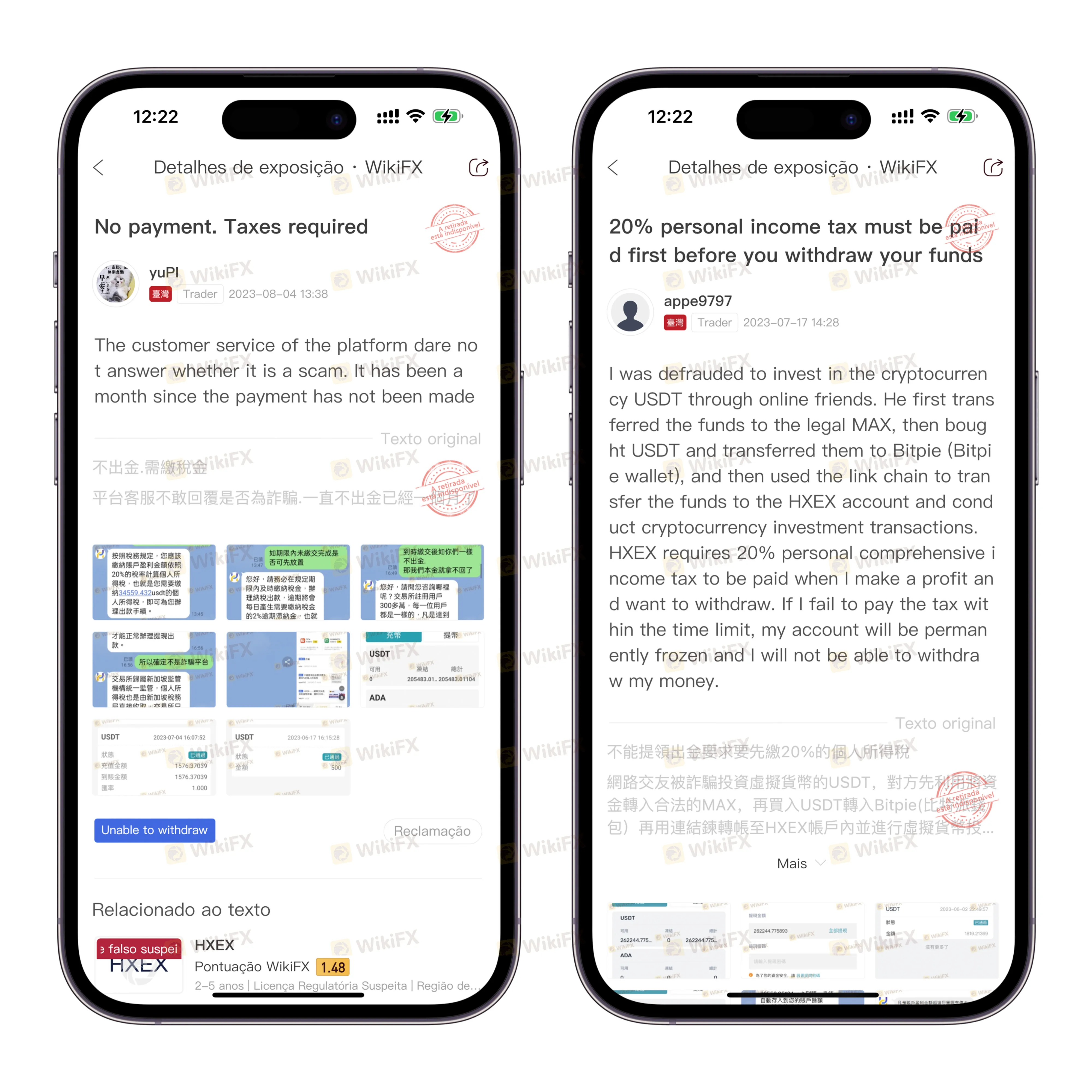 Recentemente, vários investidores relataram ao WikiFX que a plataforma HXEX exige o pagamento de 20% de imposto de renda pessoal ao fazer retiradas e que, se o imposto não for pago dentro do prazo, a conta será permanentemente bloqueada, impossibilitando a retirada de fundos.