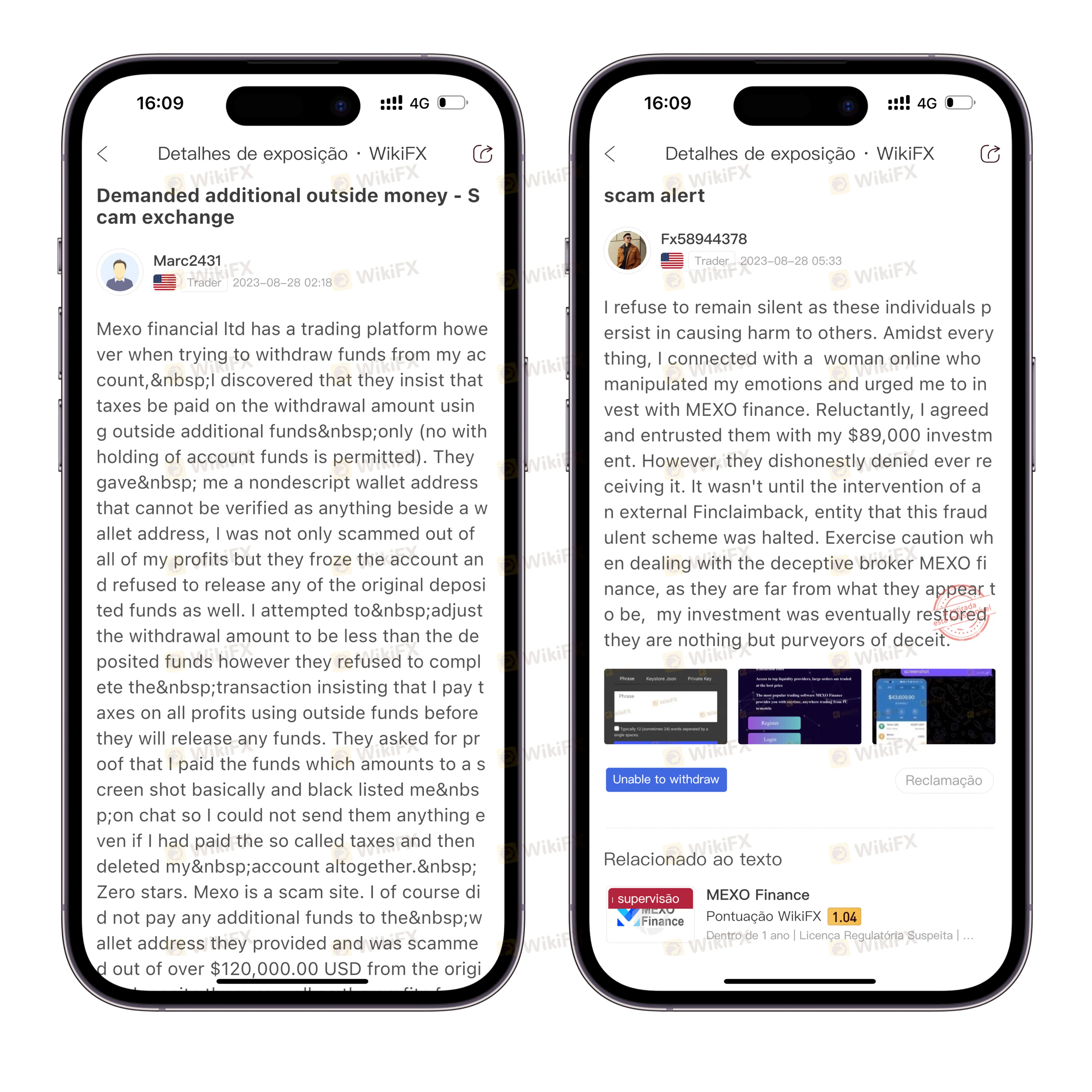 “Fx58944378” dos Estados Unidos confessou que conheceu uma mulher na Internet, que manipulou as suas emoções por vários meios, e o convenceu fortemente a investir na MEXO Finance, prometendo elevados retornos. Ele estava cético no início, mas ainda assim investiu US$ 89 mil. Como resultado, a MEXO Finance não apenas negou ter recebido o dinheiro, mas também perdeu contato.