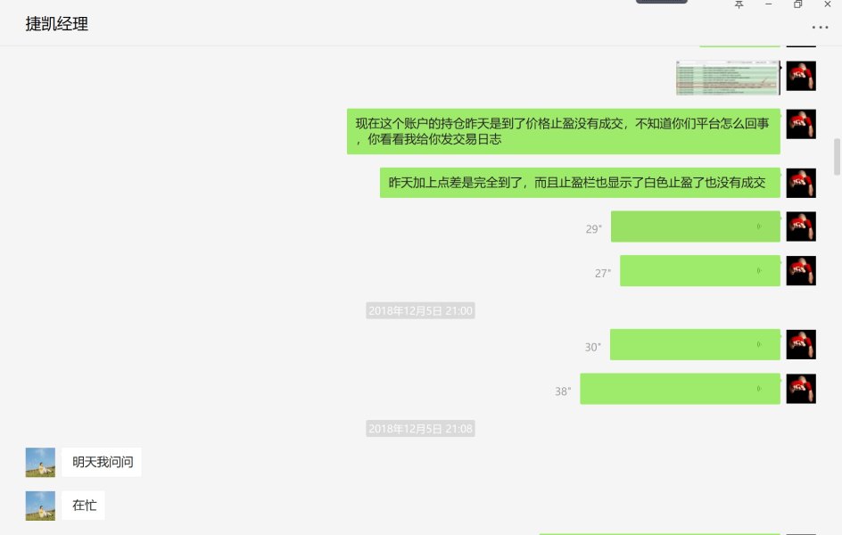 盯盘看着价格到达了设置的止盈位置不成交,让他们提供当时的点差情况,也拒绝不提供,一句点差扩大就打发了,作为交易者,我是盯着止盈位置价格到达设置的价格而没有成交,同时获利栏的价格是从预止盈的绿色变成止盈的白色而不成交,账户经理不负责,平台更是不予理会,请大家认清面目,不要在此平台做交易,远离