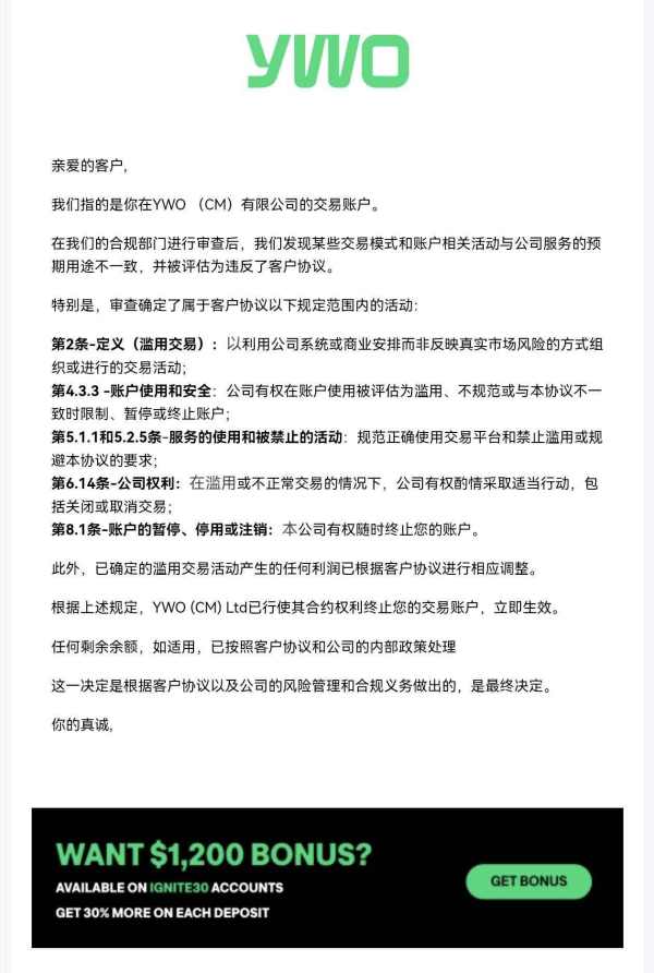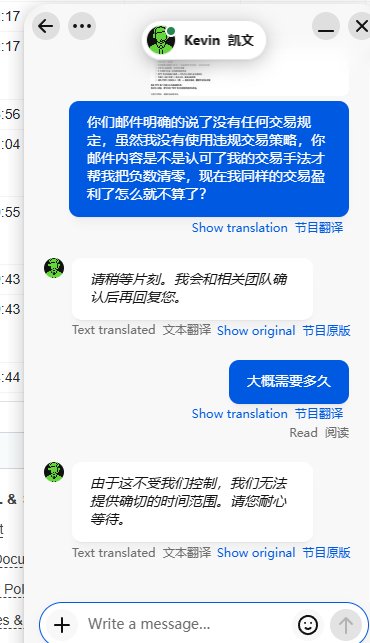 第一次入金操作爆仓亏损,平台给我发了份负数清零的邮件,附带述说平台支持任何交易规则手法,诱导我入金后由于行情利好我账户又盈利了,平台就扣除了我盈利说违规了客户协议,同样的交易策略亏损了主动给负数清零发邮件让加金,盈利了就说违规了客户协议,同样的交易策略双重标准定义,只能亏损不能盈利,而且平台看你盘面资金不断的降低杠杠,从平台宣传的1:1000降到1:50,目的就为了客户快速爆仓,纯属一个吃客户亏损的平台。